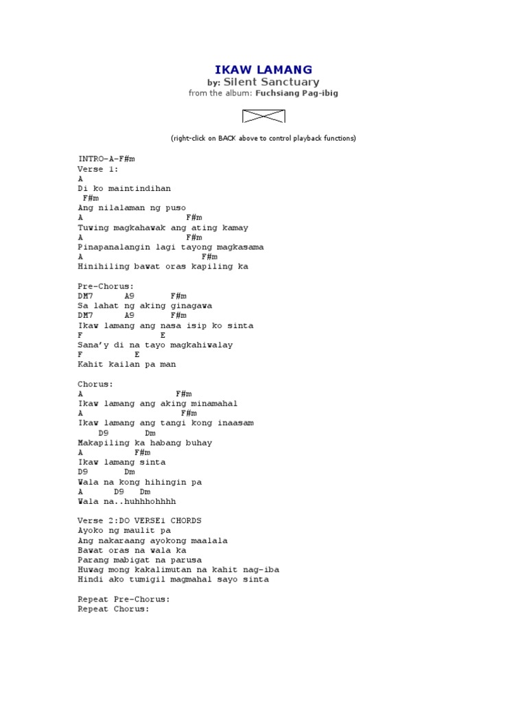 Huwag kang mag-alala okay-lang magmahal. Iwanan ninyo ako wala kong aaminin. Huwag mong kakalimutan na kahit nag-iba Hindi ako tumigil magmahal sayo sinta Pre-Chorus C9 G - Em Sa lahat ng aking ginagawa C9 G - Em Ikaw lamang ang nasa isip ko sinta FC9 E9 Sanay di na tayo magkahiwalay FC9 E9 Kahit kailan pa man Chorus G Em Ikaw lamang ang aking minamahal G Em Ikaw lamang ang tangi kong inaasam C9 Cm.